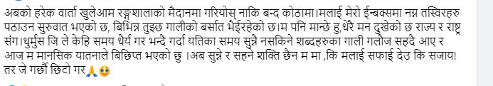 कुञ्जना घिमिरे ‘सुन्तली’ ले आफ्नो इनबक्समा नग्न तस्बिरहरू पठाउन सुरुवात भएको बताएकी छिन् । उनले आफूमाथि विभिन्न तुच्छ गालीको समेत बर्सात भएको भन्दै आफ्नो मन दुखेको बताएकी छिन् ।